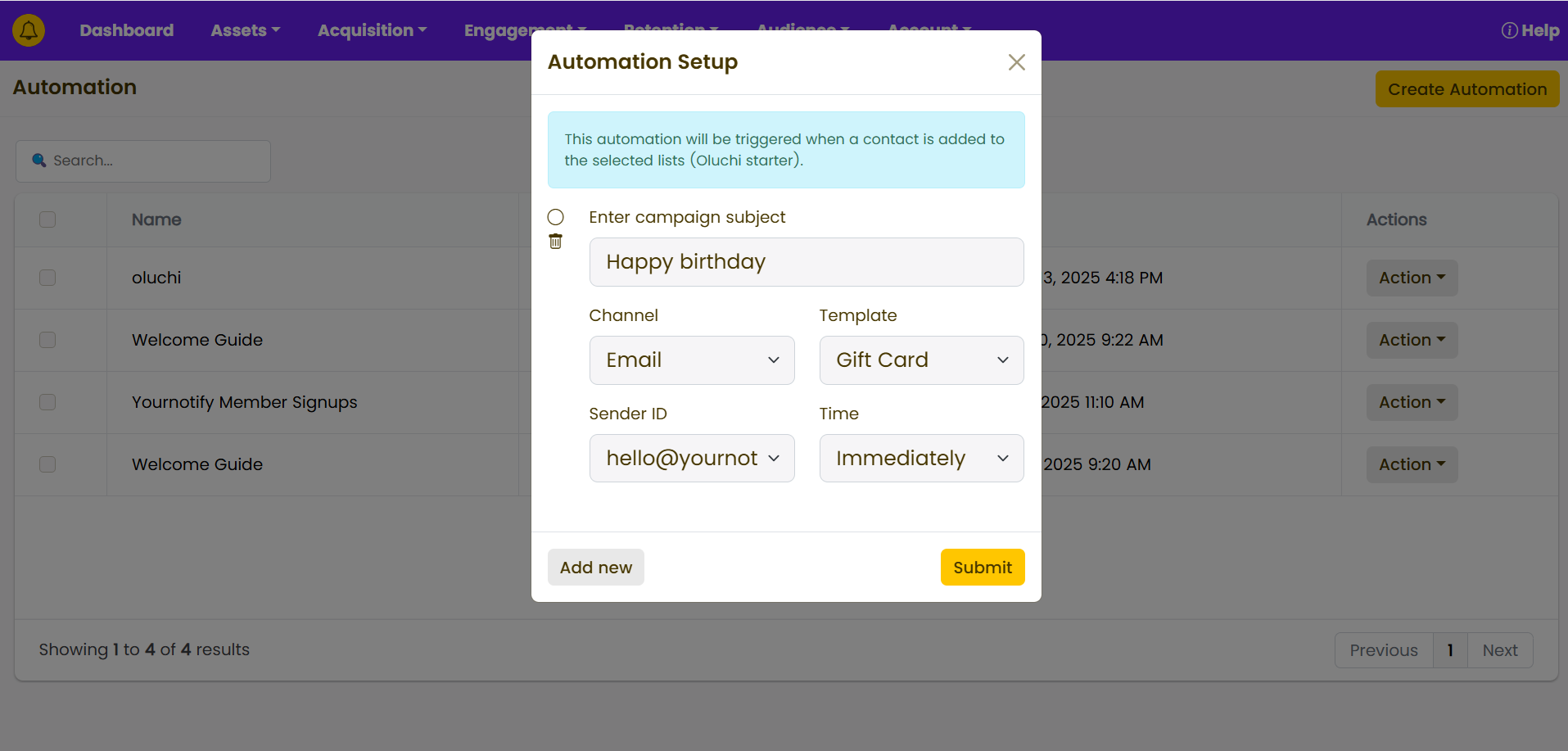 STEP 3: Click on “Create Automation” , select the automation type “Reminder” and click on “Submit“