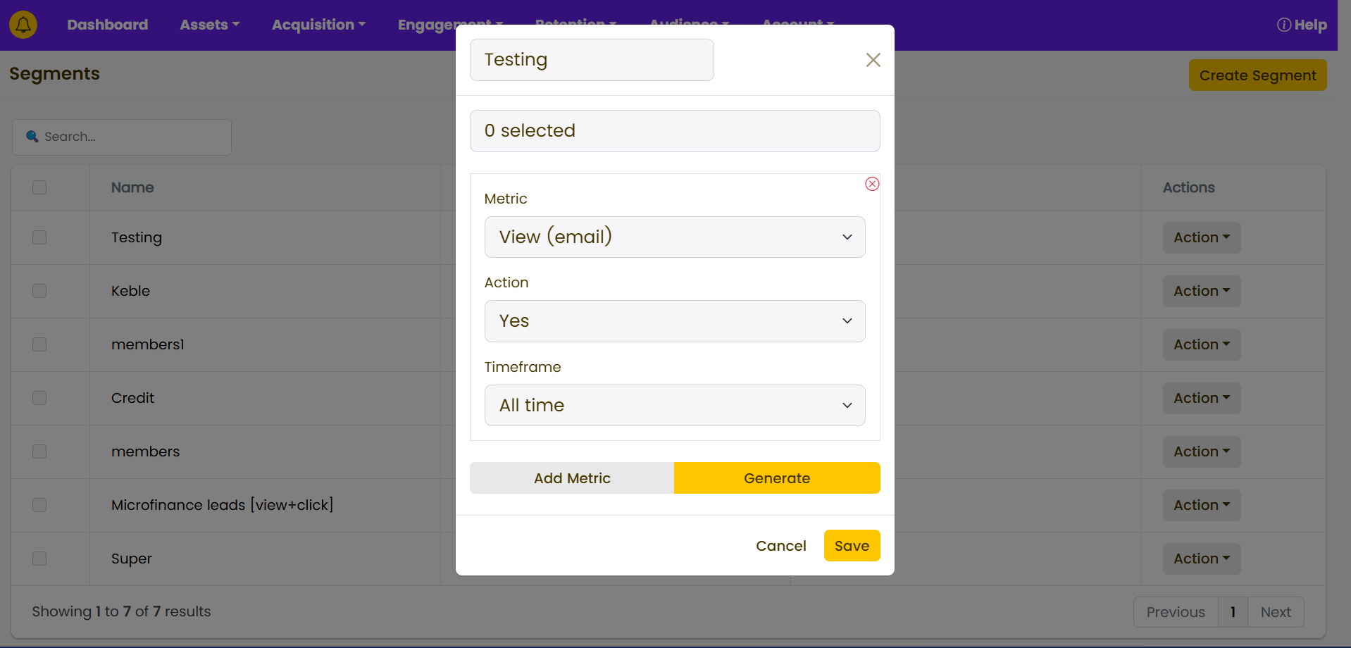 - Campaign: For segments based on specific campaign metrics, such as clicks, views, delivery etc
