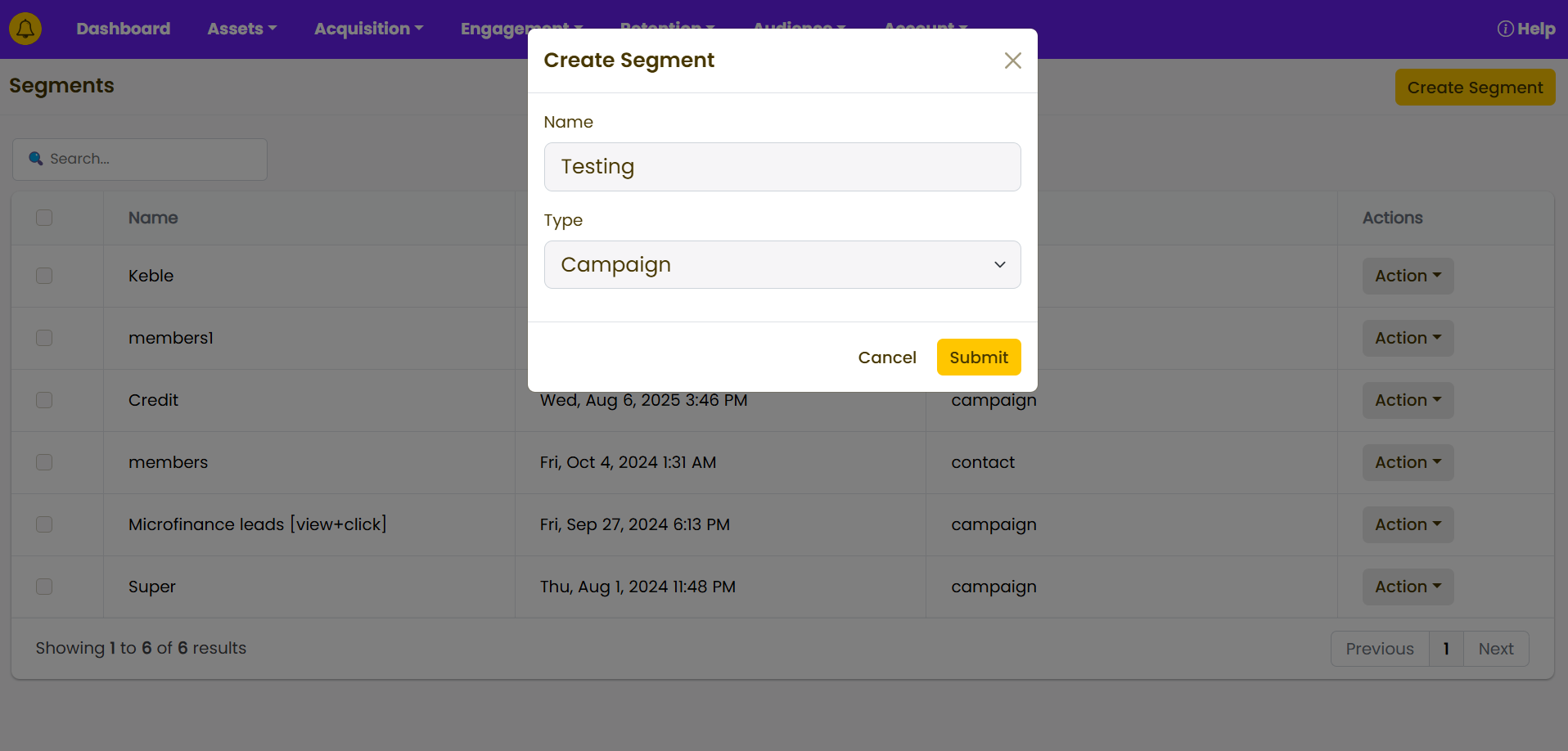 STEP 3: Click on “Create Segments”, Enter the Segment’s Name.