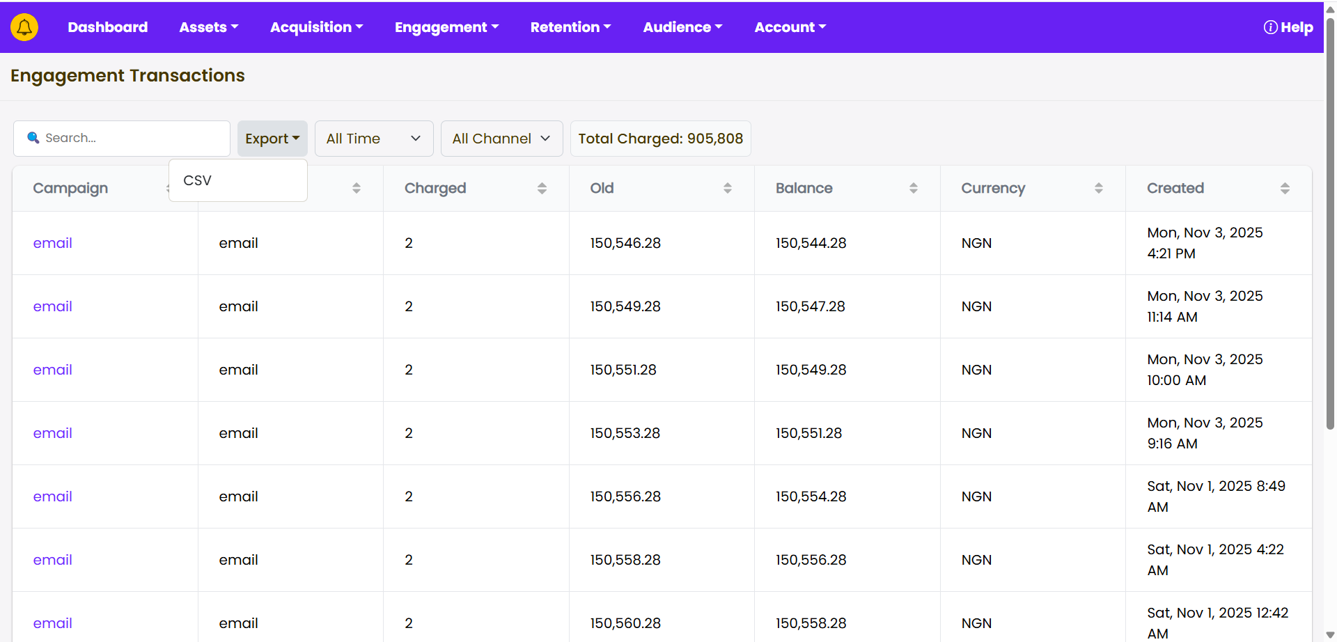 Campaign Transaction provides a detailed breakdown of your campaign spending, ensuring transparency and financial control over your marketing activities. With this feature, you can download a comprehensive report that includes key transaction details such as the amount spent, credits charged, channel used (SMS or email), your account balance, and the exact date of each charge. Follow these steps to export your campaign transactions.