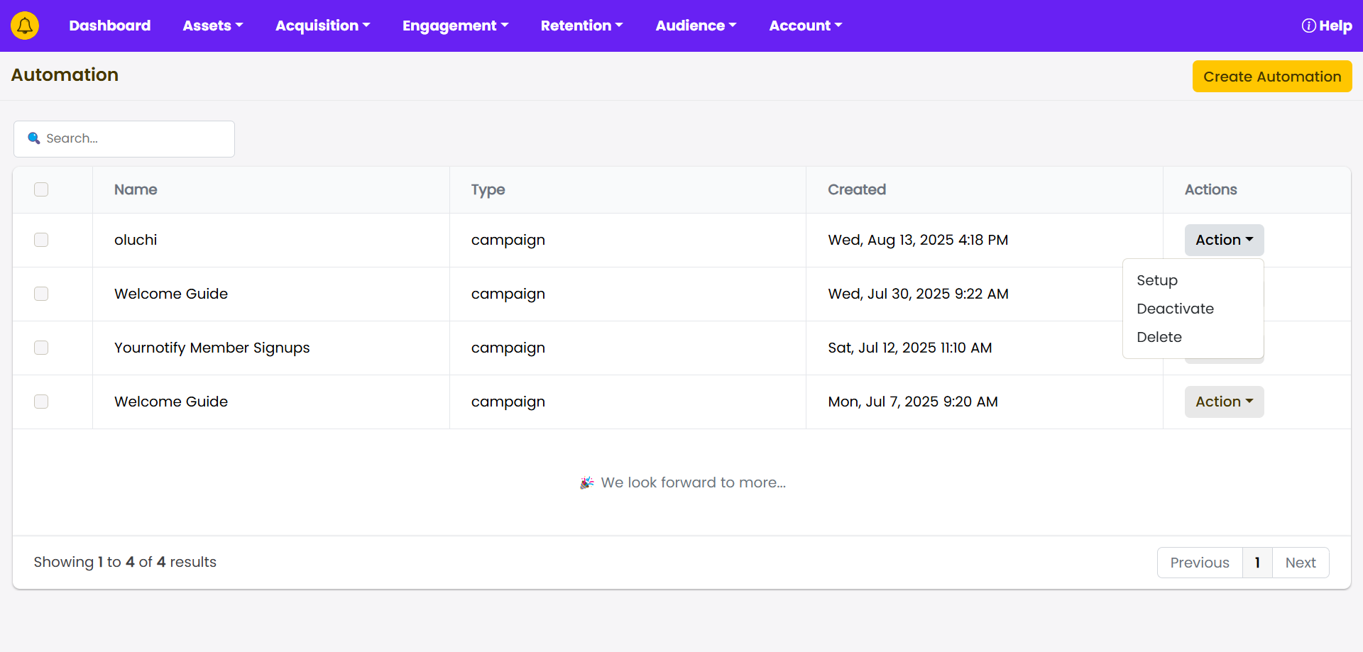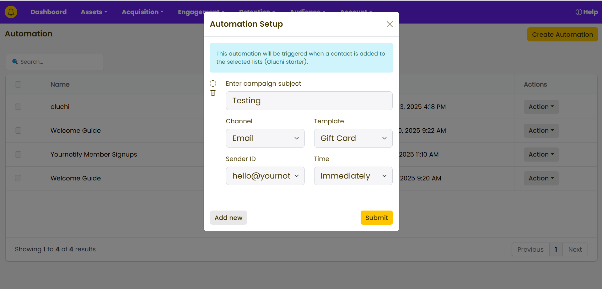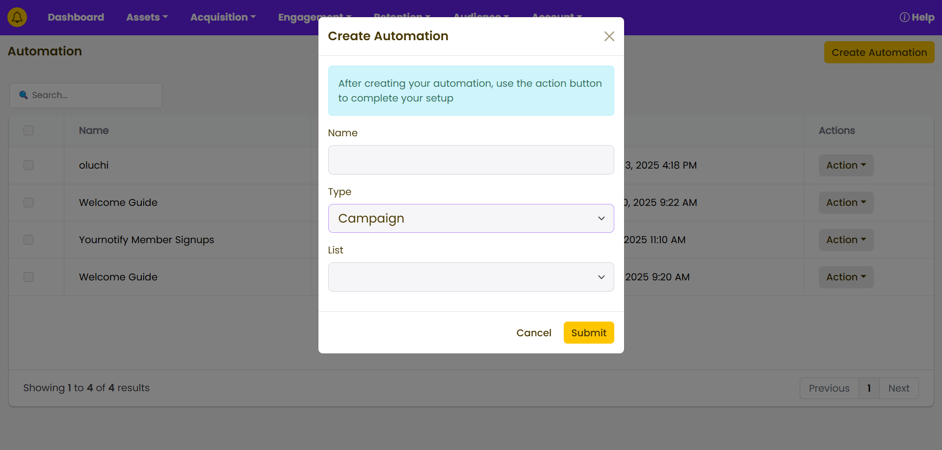 STEP 3: Click on “Create Automation” , select “Campaign” or “Automation”, based on the type of automation you intend to run, and click on “Submit”.