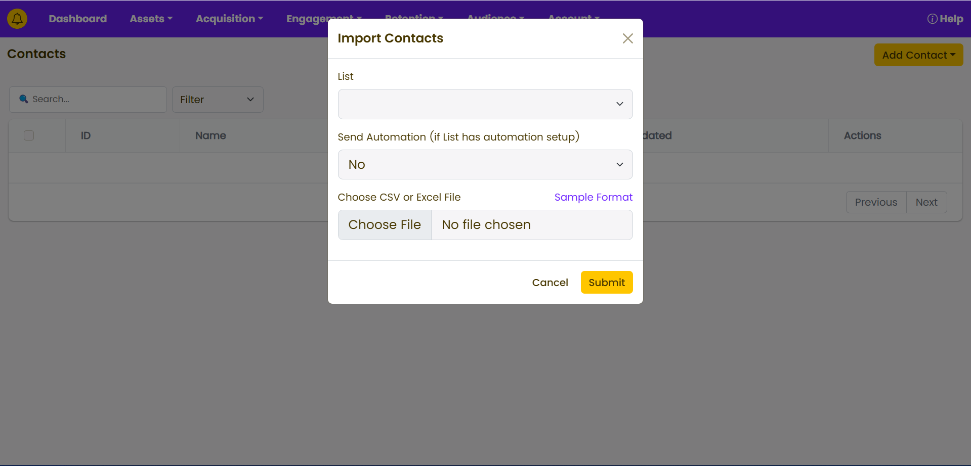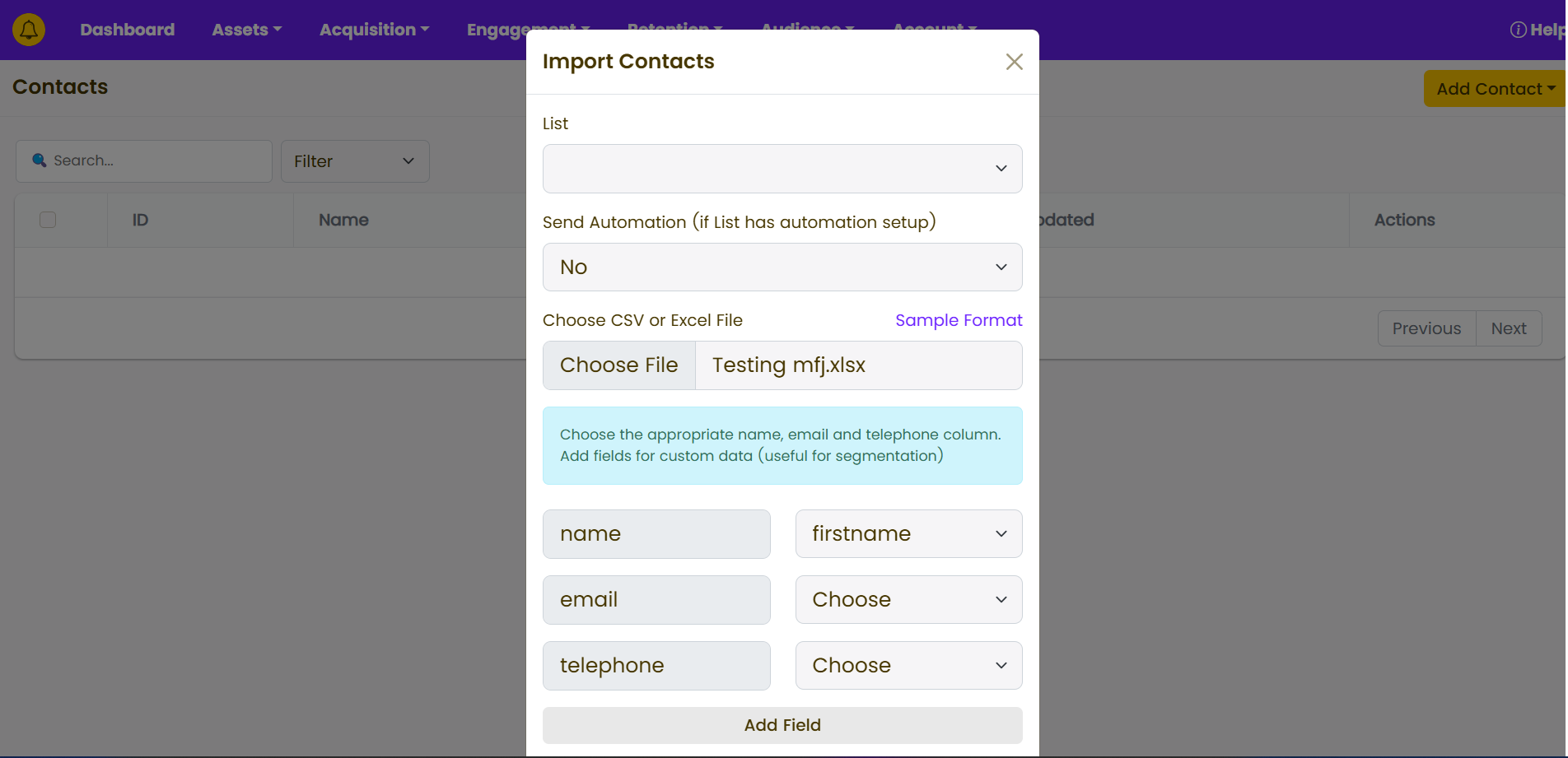 STEP 4: Our system automatically validates your contacts, eliminating invalid email addresses and duplicates. Simply select the contact file to upload in Excel format (it’s expected that your contacts are saved in this format) to ensure a clean list. Indicate If the list has automation setup.
