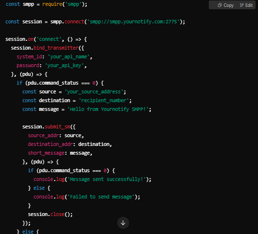 Connecting to Yournotify SMPP using Node.js allows businesses to send and receive SMS messages efficiently. Node.js makes it easy to integrate SMPP into applications, automate messaging, and manage workflows in real-time. Here’s how to connect to Yournotify SMPP using Node.js.