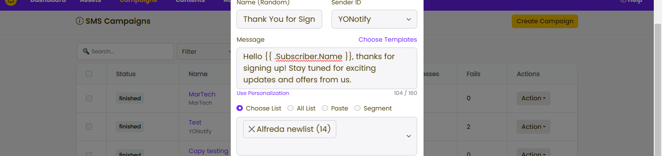 In this example, the API fetches and inserts the full name stored in the list under the name field for personalized communication.