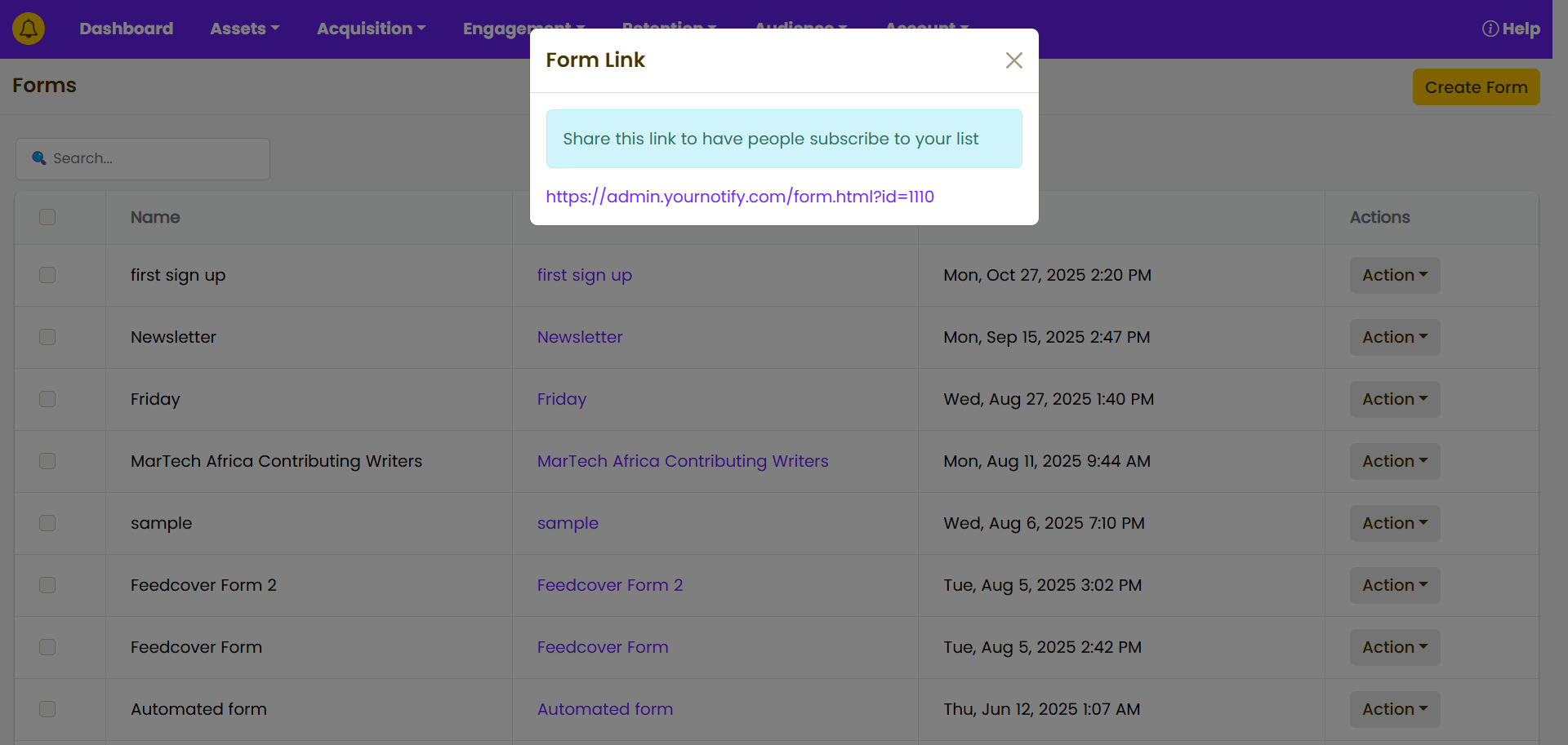 A signup form is a powerful way to extend the reach of your email and SMS marketing and grow your audience. Yournotify offers several options to attract subscribers to your website using our embedded form link or you can link to our hosted form. Here is a guide on how to create a subscription form on yournotify.
