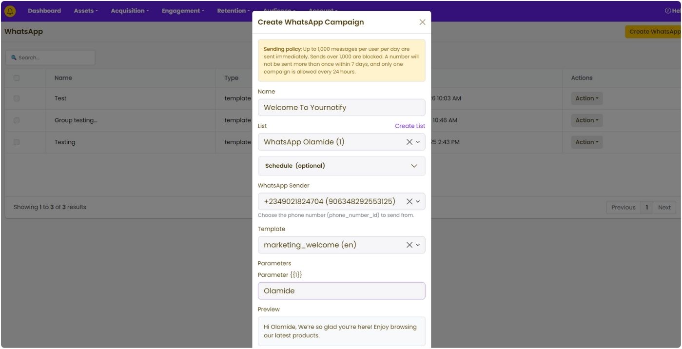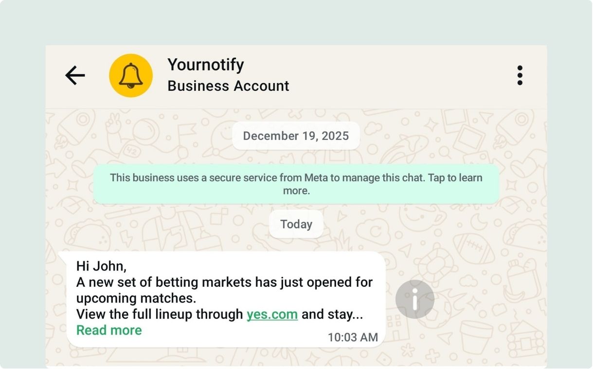 Yournotify WhatsApp Campaign feature lets businesses send bulk WhatsApp messages to customers instantly and at scale. Easily share promotions, announcements, updates, and alerts while maintaining high delivery rates and real-time engagement all from one simple dashboard.